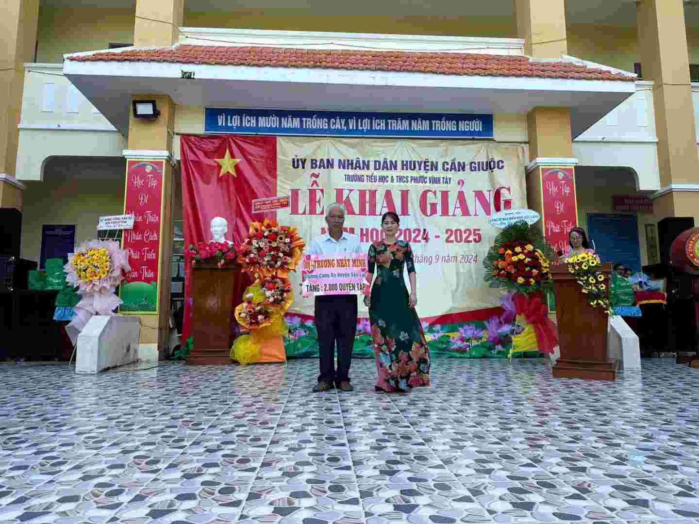 Một trong những điểm nhấn của buổi lễ khai giảng năm nay là chương trình “Tiếp sức đến trường” và “Đồng hành cùng ước mơ” với sự tham gia của các mạnh thường quân. Nhà trường đã nhận được sự hỗ trợ quý báu từ nhiều cá nhân và tổ chức, giúp đỡ các em học sinh có hoàn cảnh khó khăn có thêm điều kiện học tập. Ông Trương Nhật Minh - Trưởng Công an huyện Bến Lức đã tặng 2000 quyển tập, Công ty cổ phần Long Hậu gửi 100 phần quà cho 50 học sinh cấp Tiểu học và 50 học sinh cấp THCS. Bên cạnh đó, Công ty bảo hiểm ISSC và Chubb Life cũng đóng góp 50 chiếc ba lô cho các em học sinh Tiểu học. Đây là những món quà ý nghĩa, giúp các em vượt qua khó khăn, có thêm động lực để tiếp tục học tập, nuôi dưỡng ước mơ của mình.