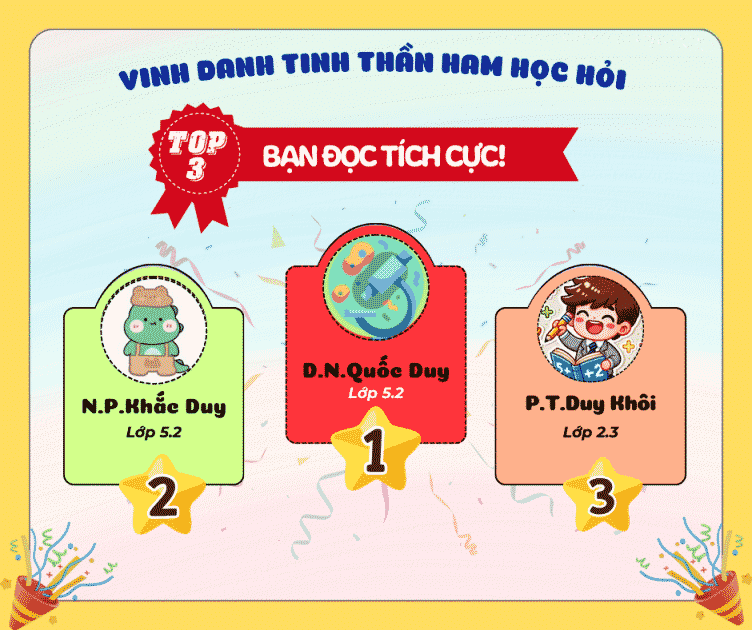 Nhằm khuyến khích tinh thần tự học và sử dụng hiệu quả Thư Viện Số, nhà trường đã tổ chức hoạt động bình chọn "Học Sinh Tích Cực với Thư Viện Số" và vinh danh 3 bạn học sinh có thành tích nổi bật nhất trong tháng. Dẫn đầu danh sách là Dương Nguyễn Quốc Duy (Lớp 5/2) với số lượt truy cập và hoàn thành bài kiểm tra nhiều nhất. Xếp thứ hai là Nguyễn Phùng Khắc Duy (Lớp 5/2) với những đóng góp tích cực trong việc chia sẻ tài nguyên học tập. Vị trí thứ ba thuộc về Phạm Trần Duy Khôi (Lớp 2/3) một bạn nhỏ chăm chỉ với tinh thần học tập đáng ngưỡng mộ.
